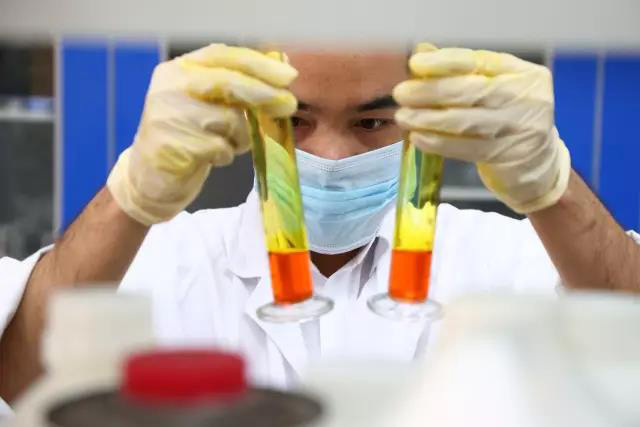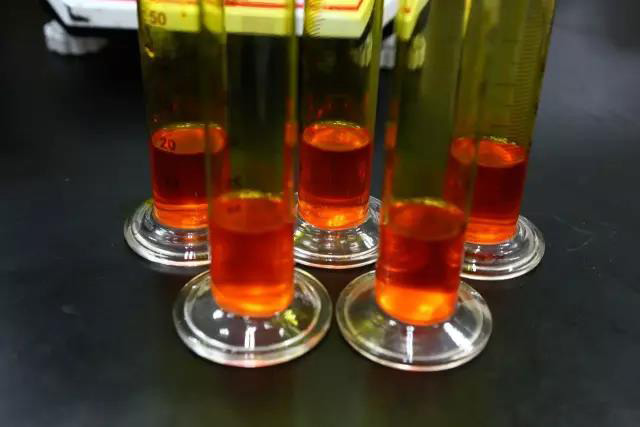 李工首先取樣彩色墨水,然后往5個量筒中分別加入20g墨水原液,分別滴加5款成熟配方的水性油墨消泡劑。