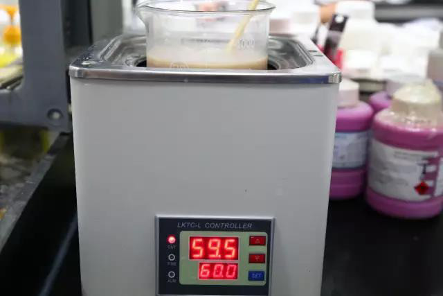 李工將隔離液取樣至燒杯中,然后進行原液與水的1:7開稀。將燒杯放入水浴鍋中進行55℃的恒溫加熱,加熱過程中,,將開稀液攪拌均勻。